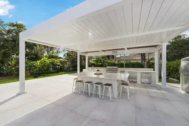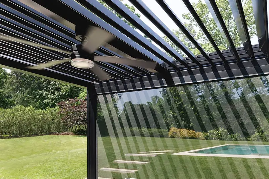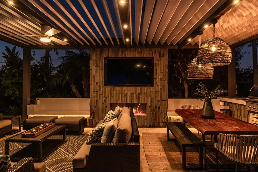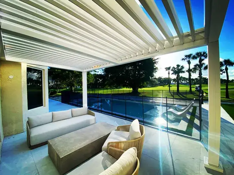 Create a shaded outdoor living area with motorized louvers that adjust throughout the day, helping keep your backyard comfortable in changing weather.